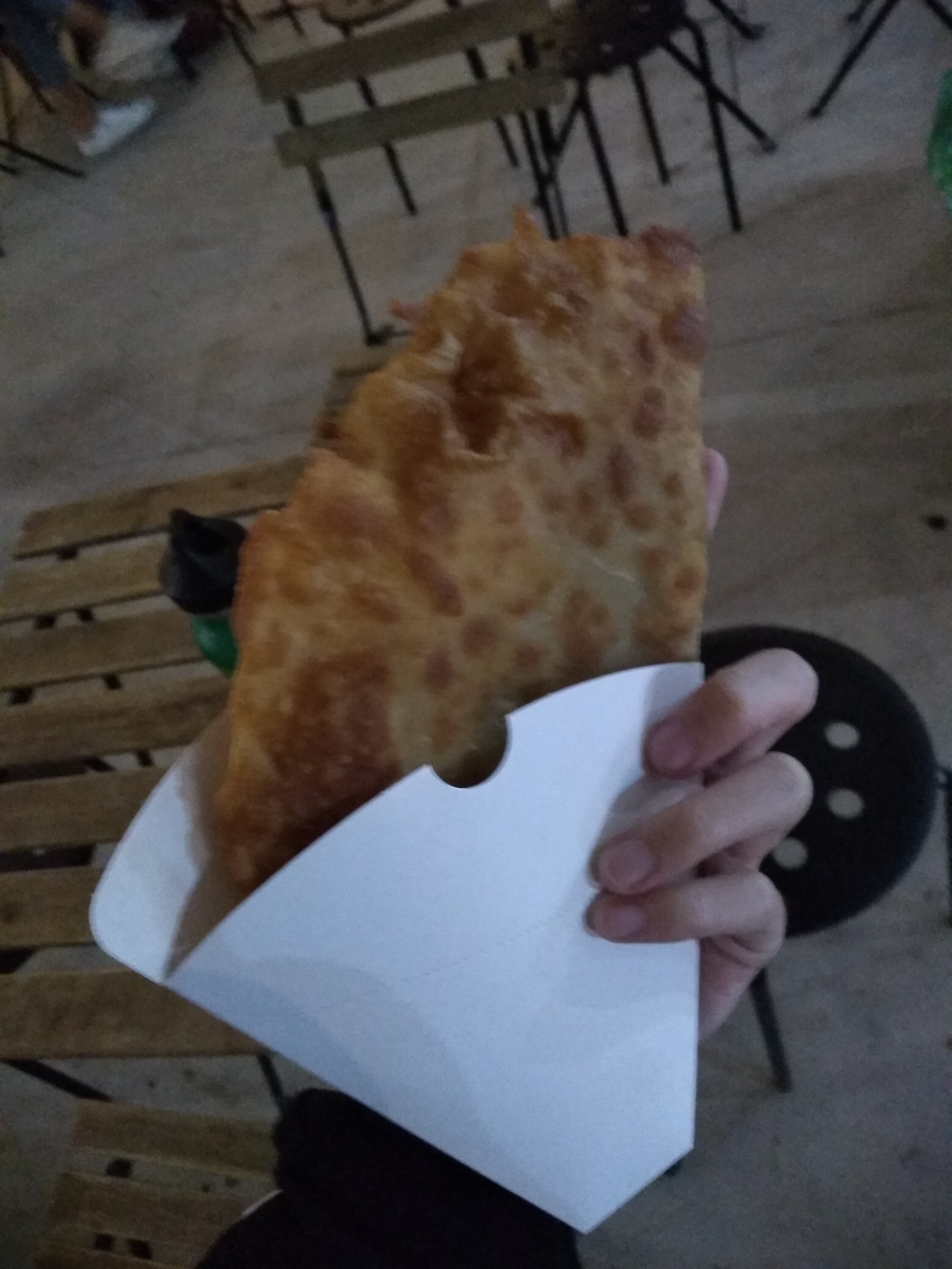 Cheburek. This thing is a deep fried turnover that has minced meat and onions